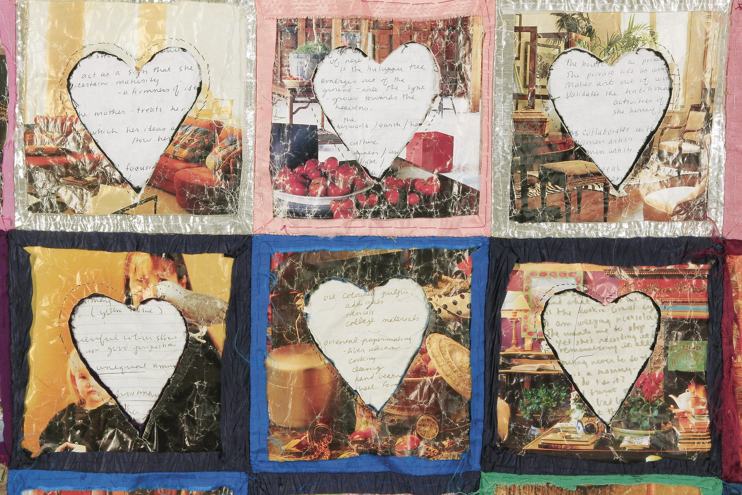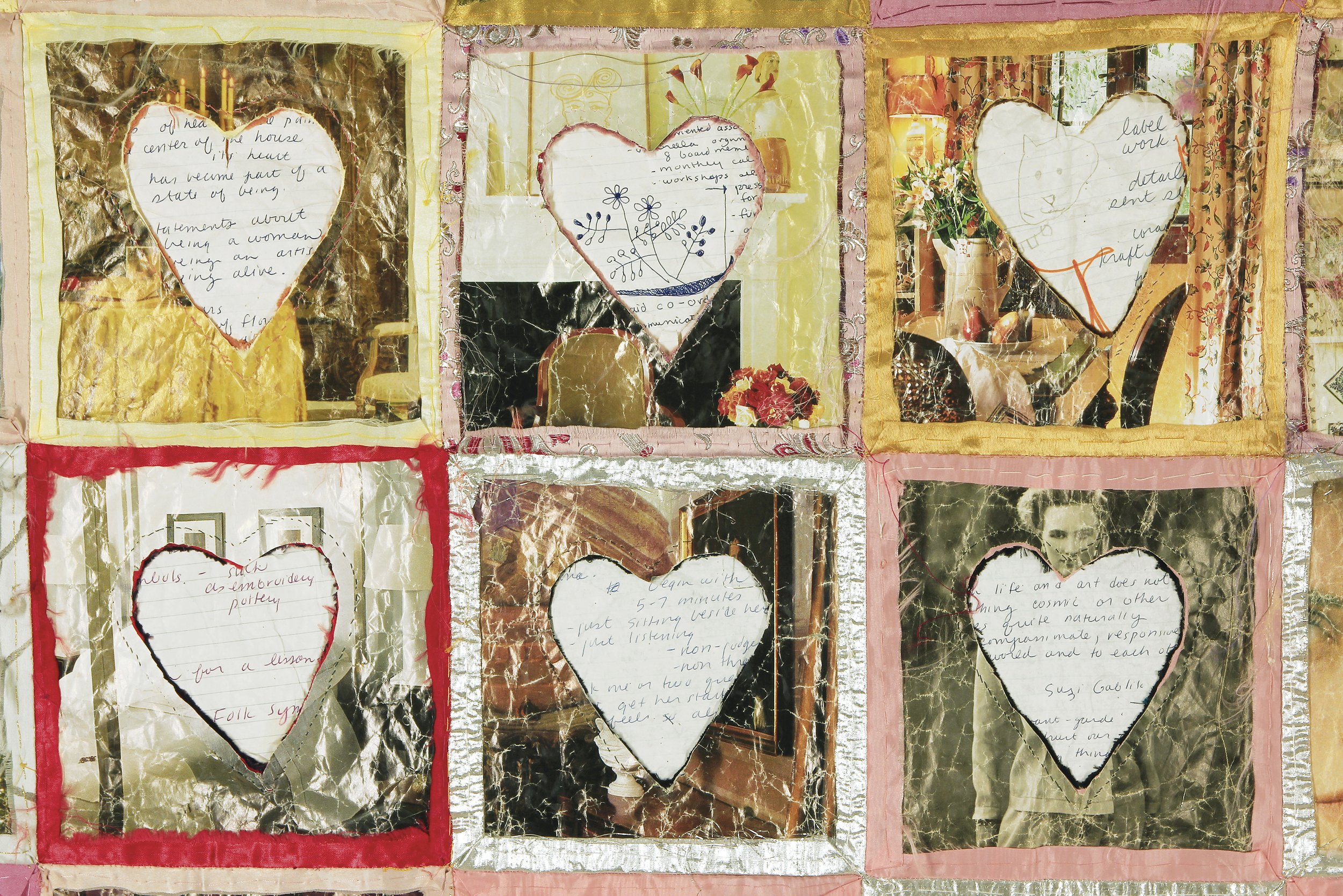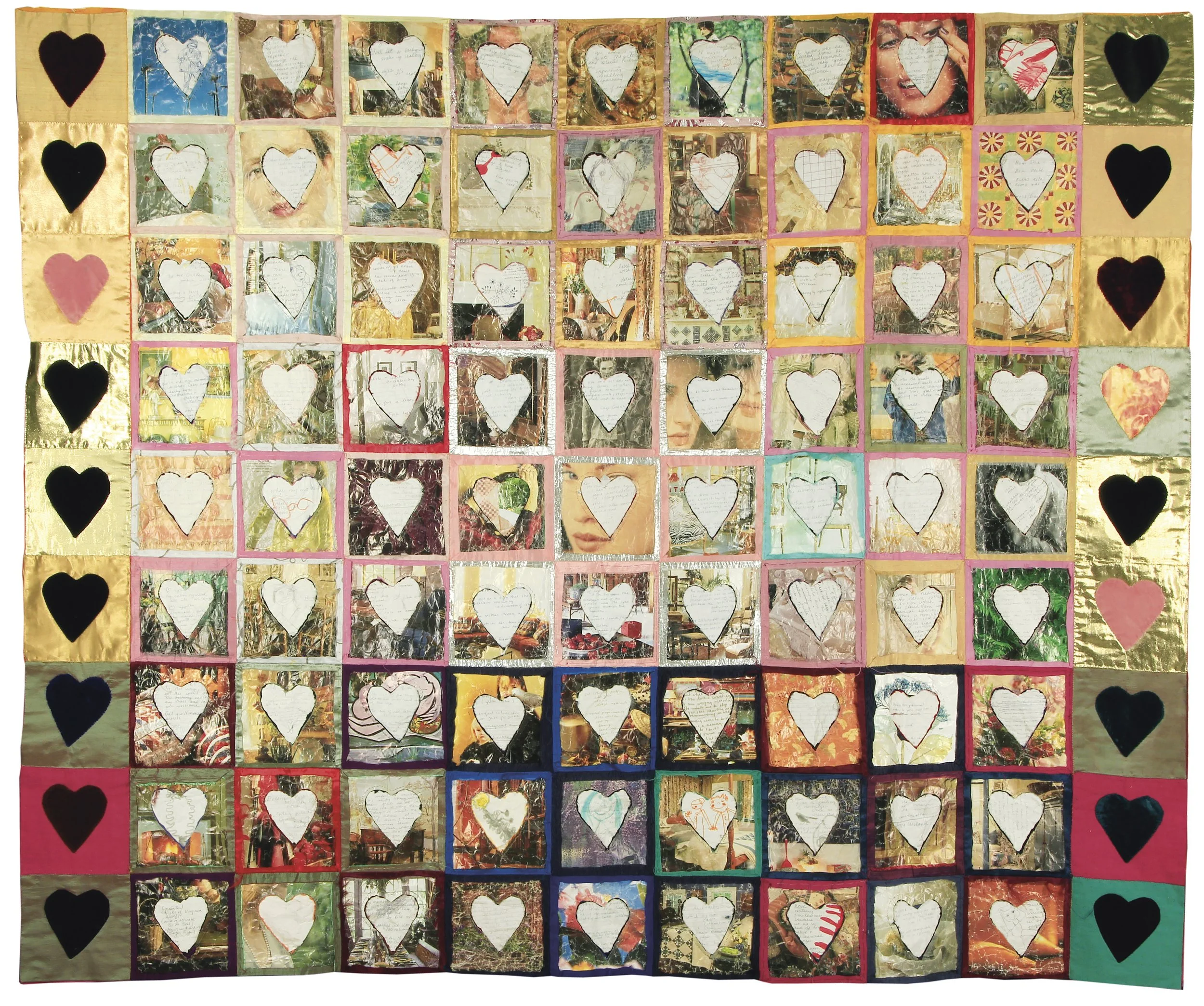 a two-sided piece. velvet, taffeta, journal and magazine papers, 64” x 77” (162 cm x 195 cm), 2002.