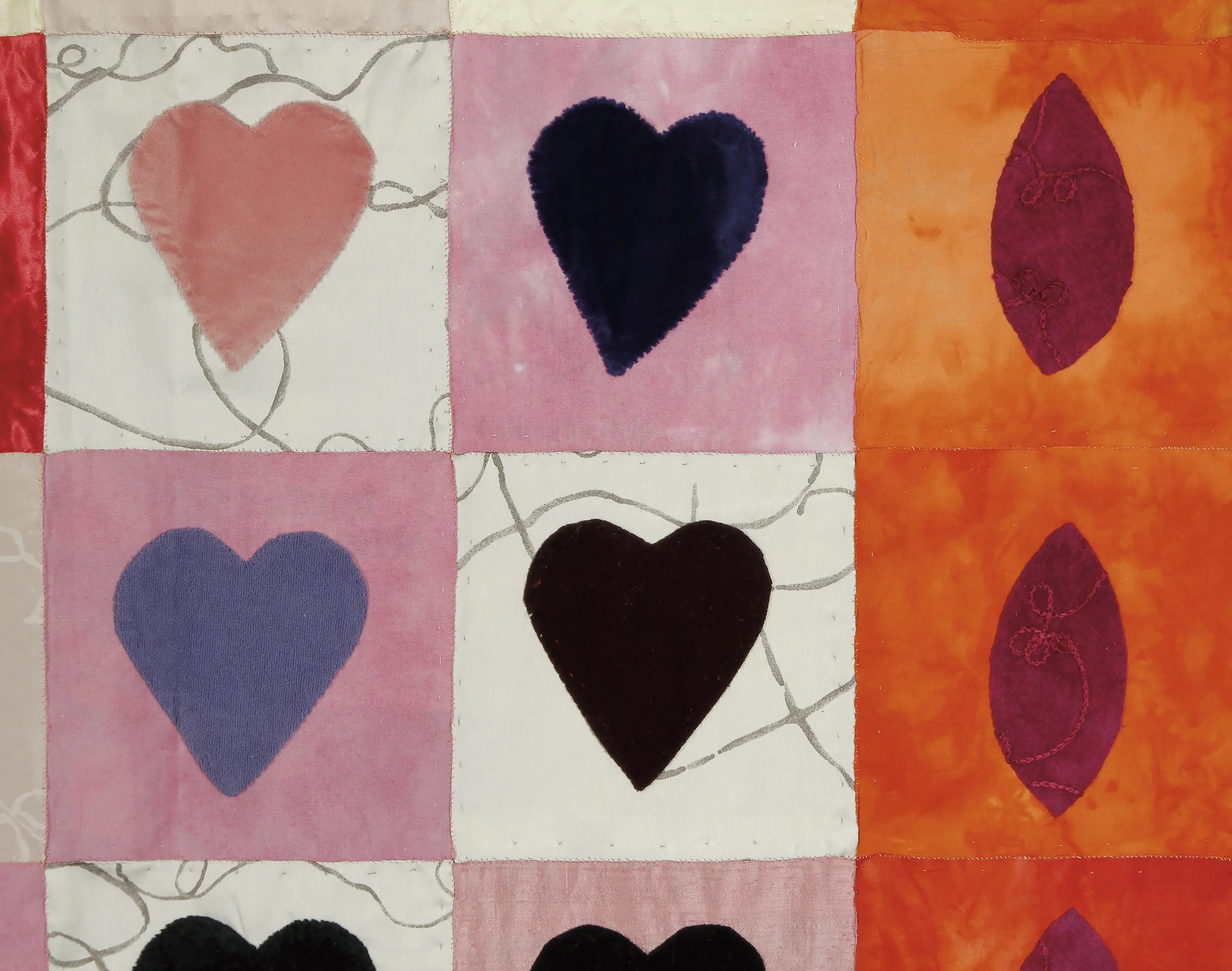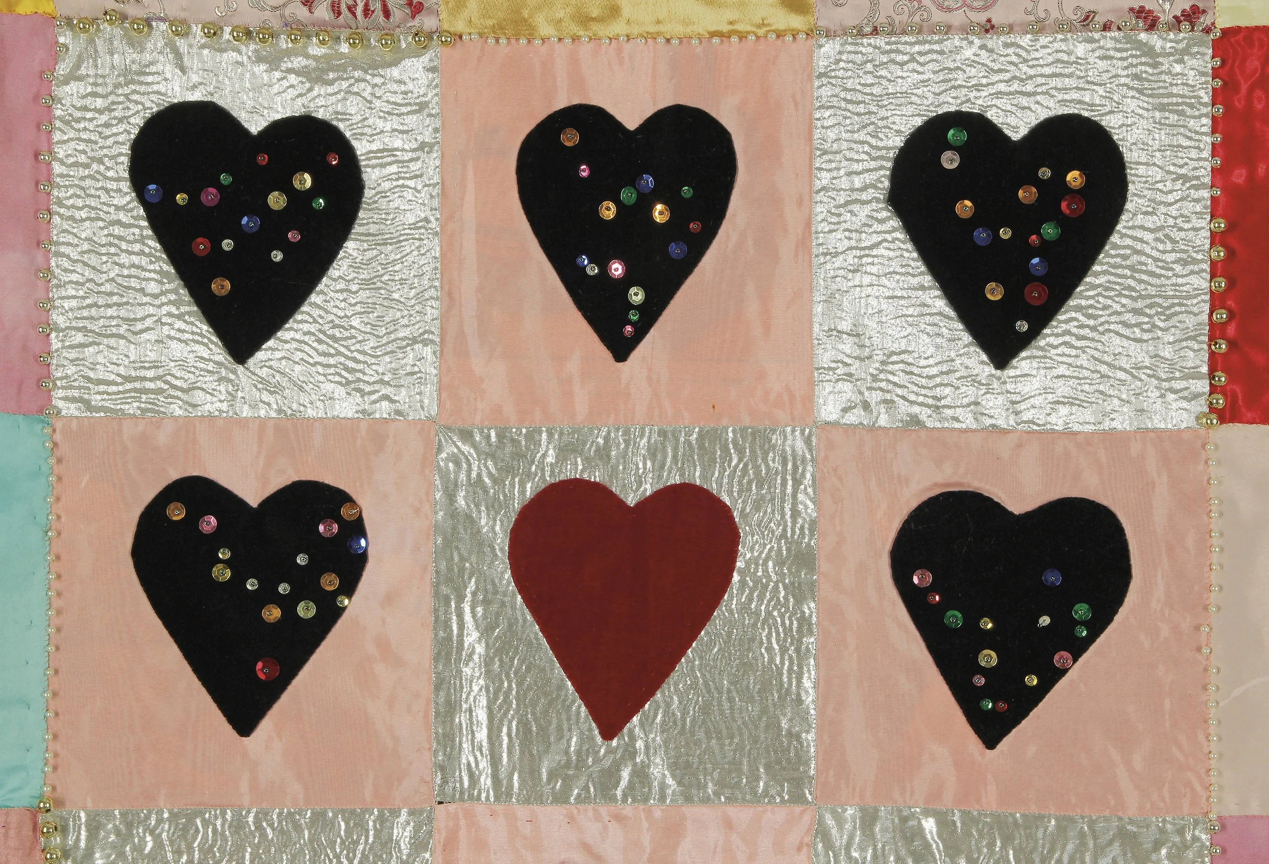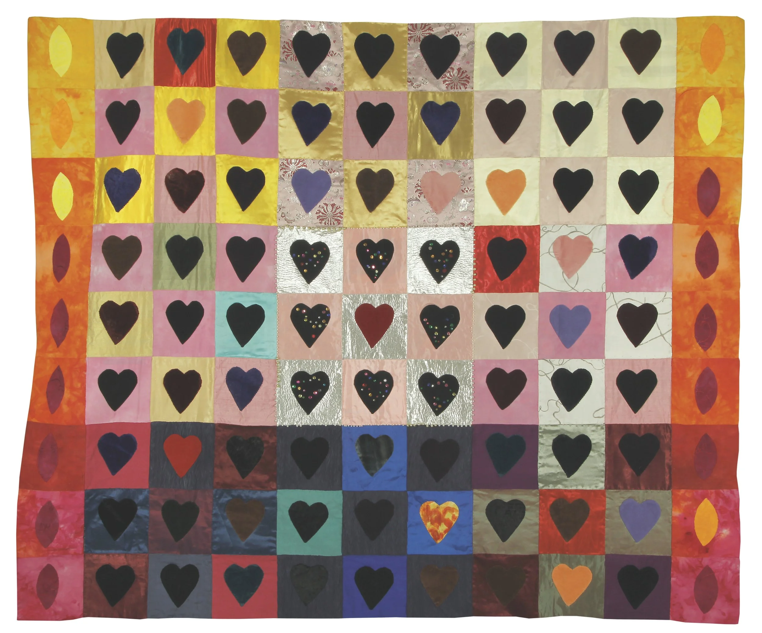 a two-sided piece. velvet, taffeta, journal and magazine papers, 64” x 77” (162 cm x 195 cm), 2002.