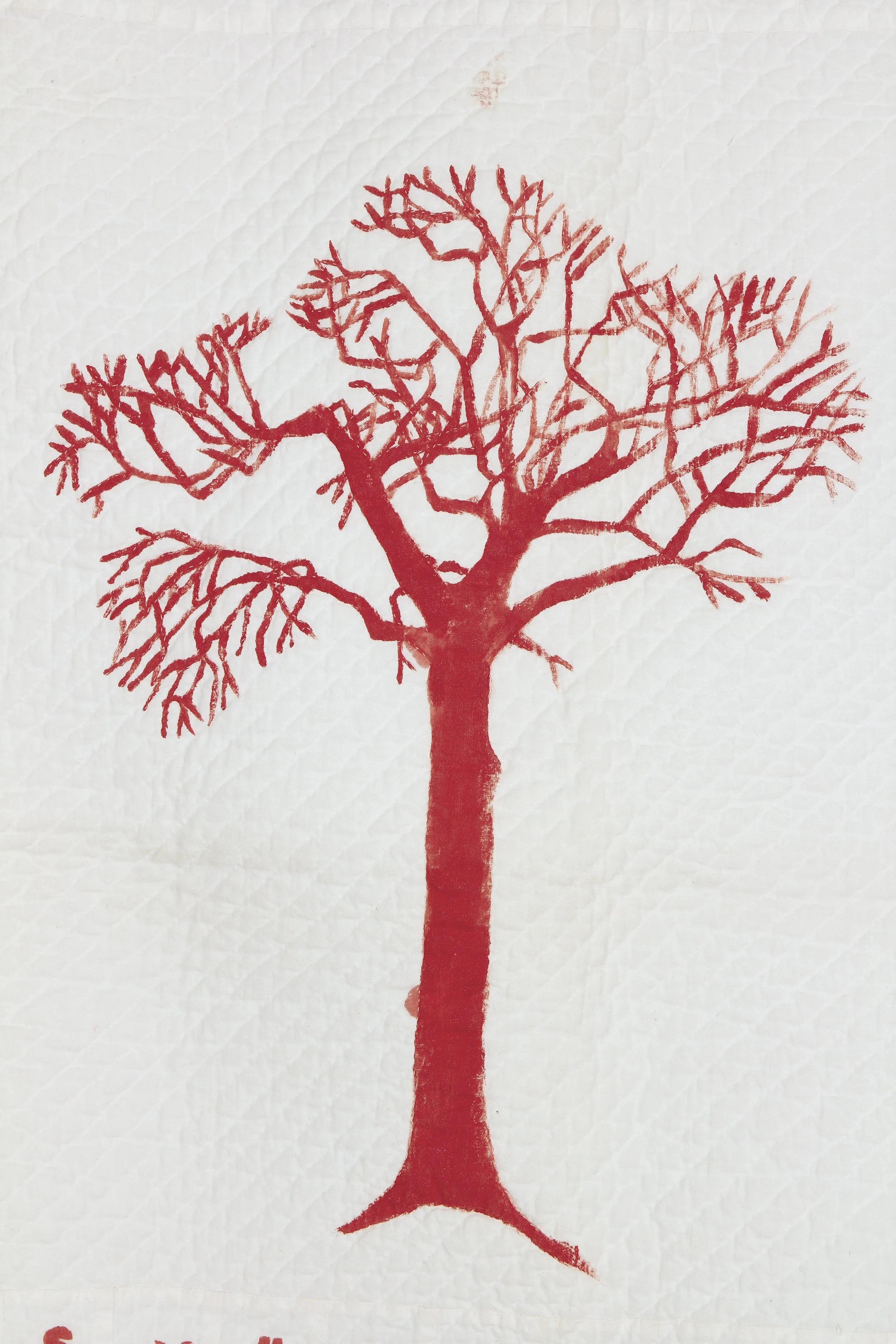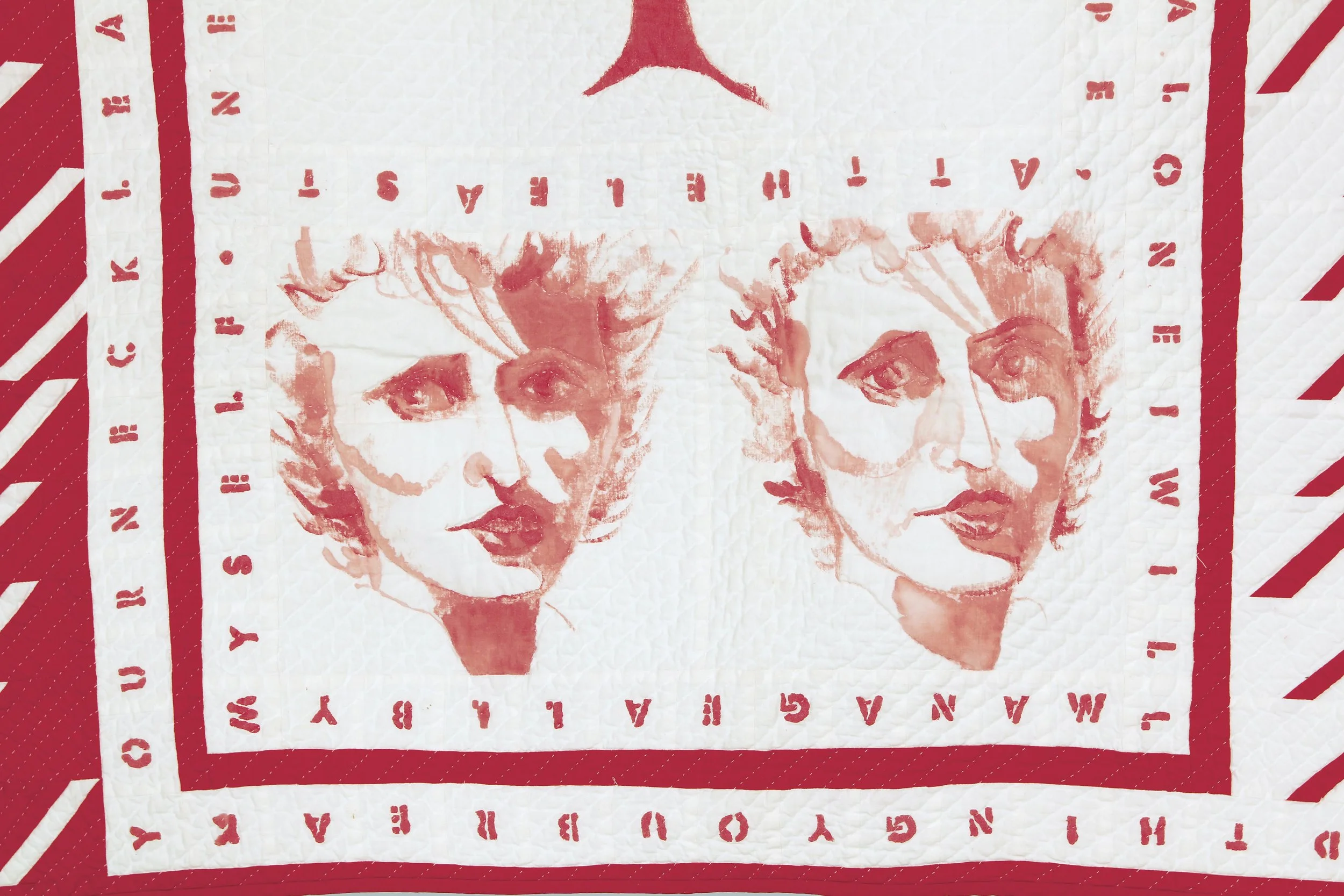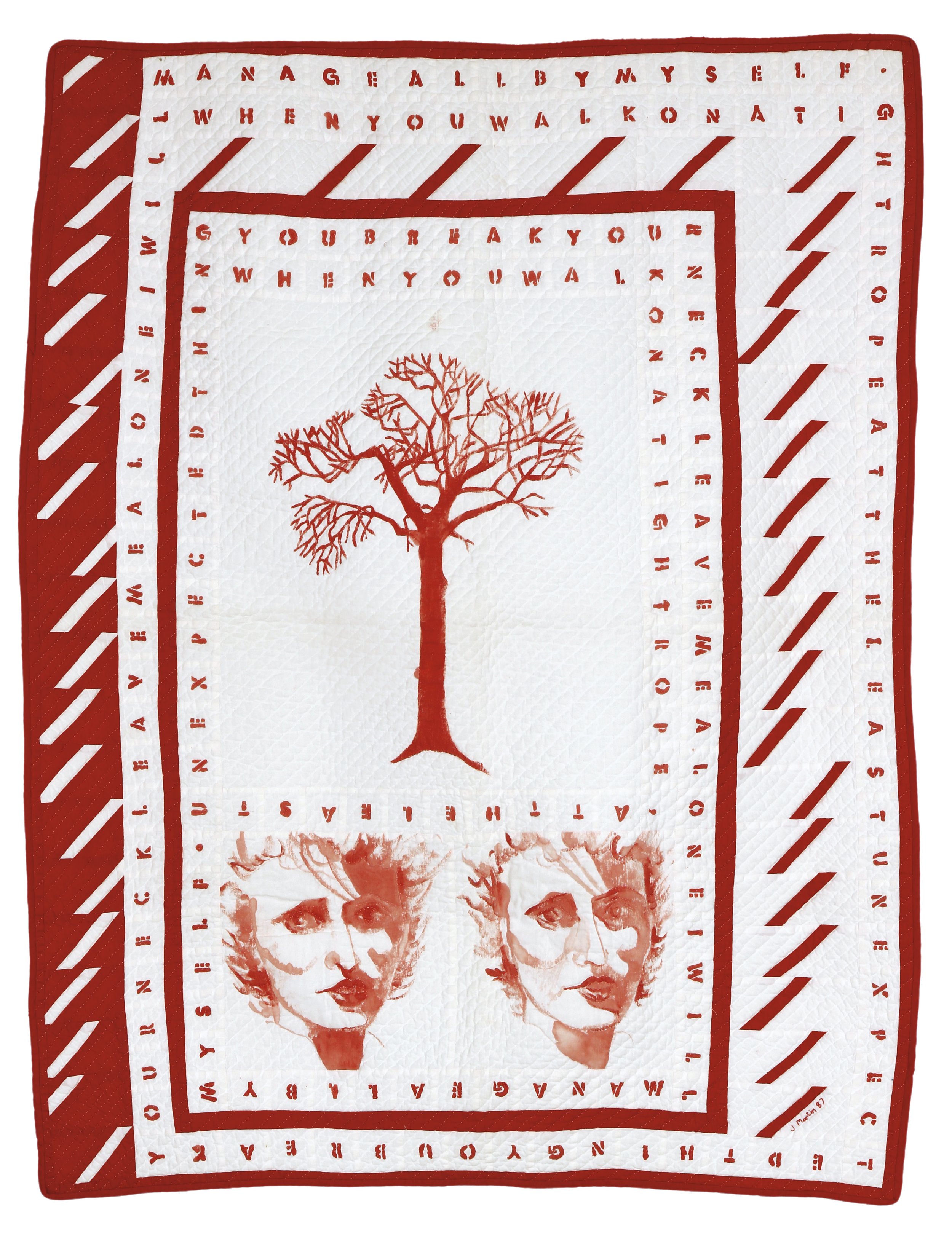 fabric paint on cotton, machine pieced, hand quilted, 49” x 39” (124.5 cm x 99 cm), 1987.
