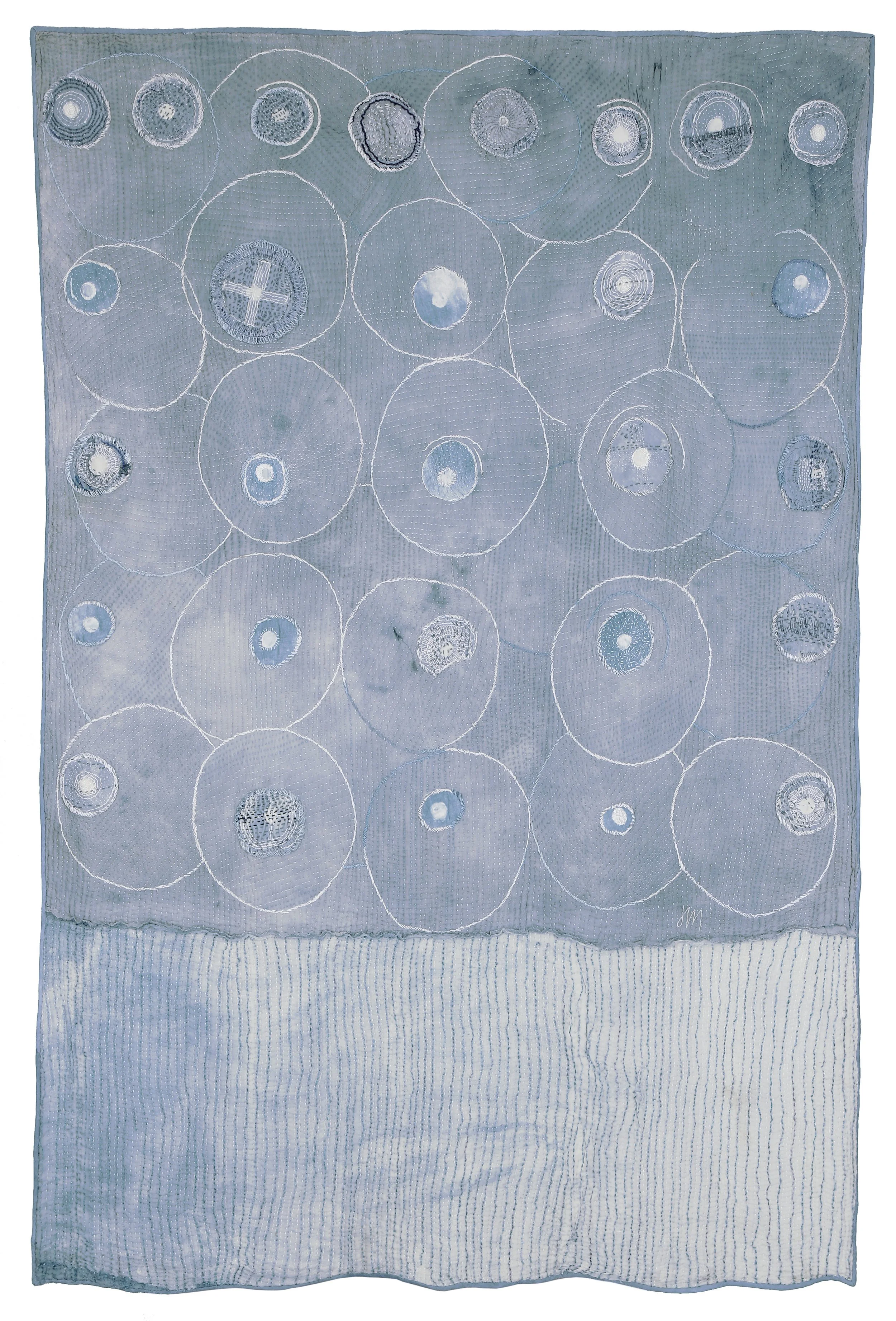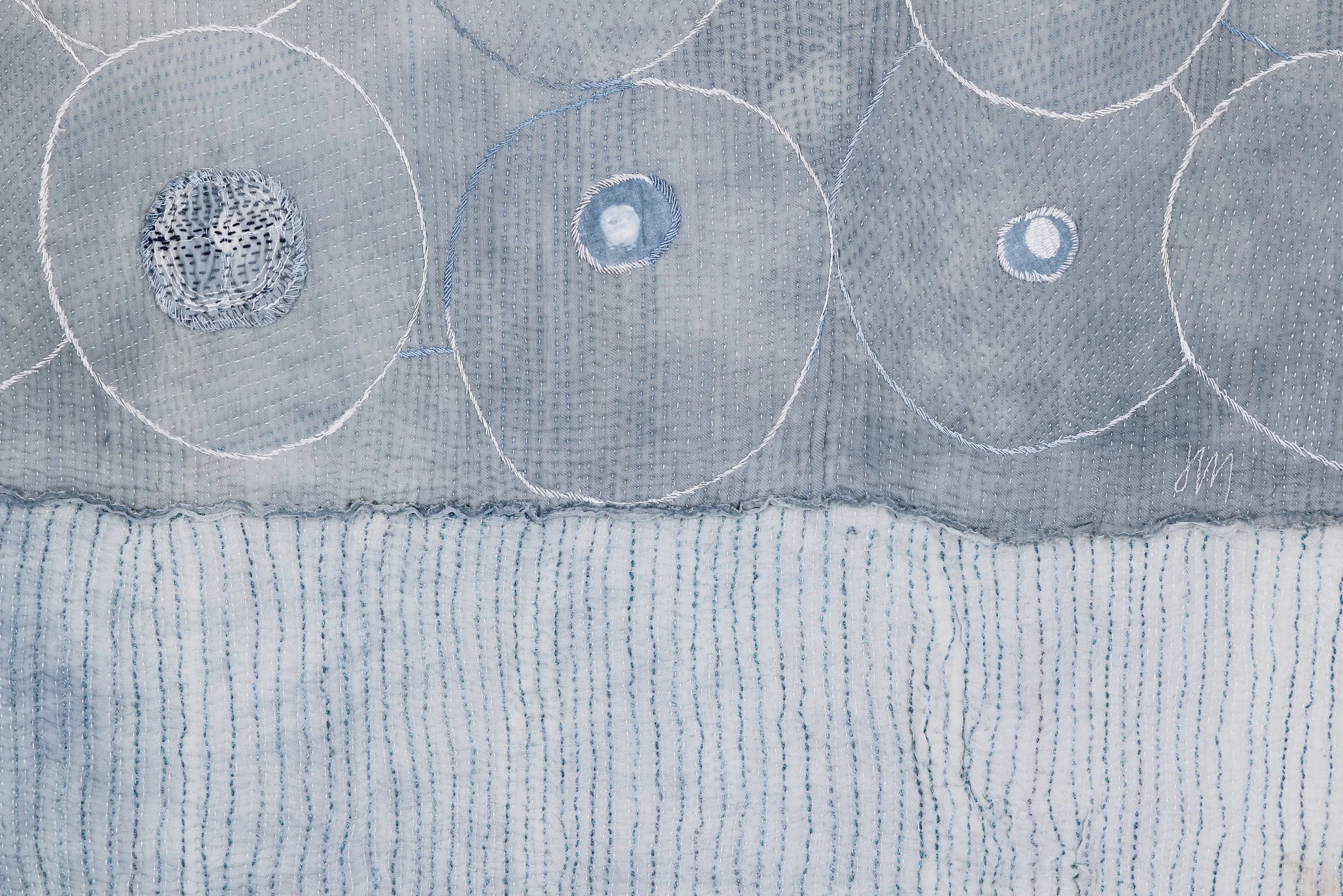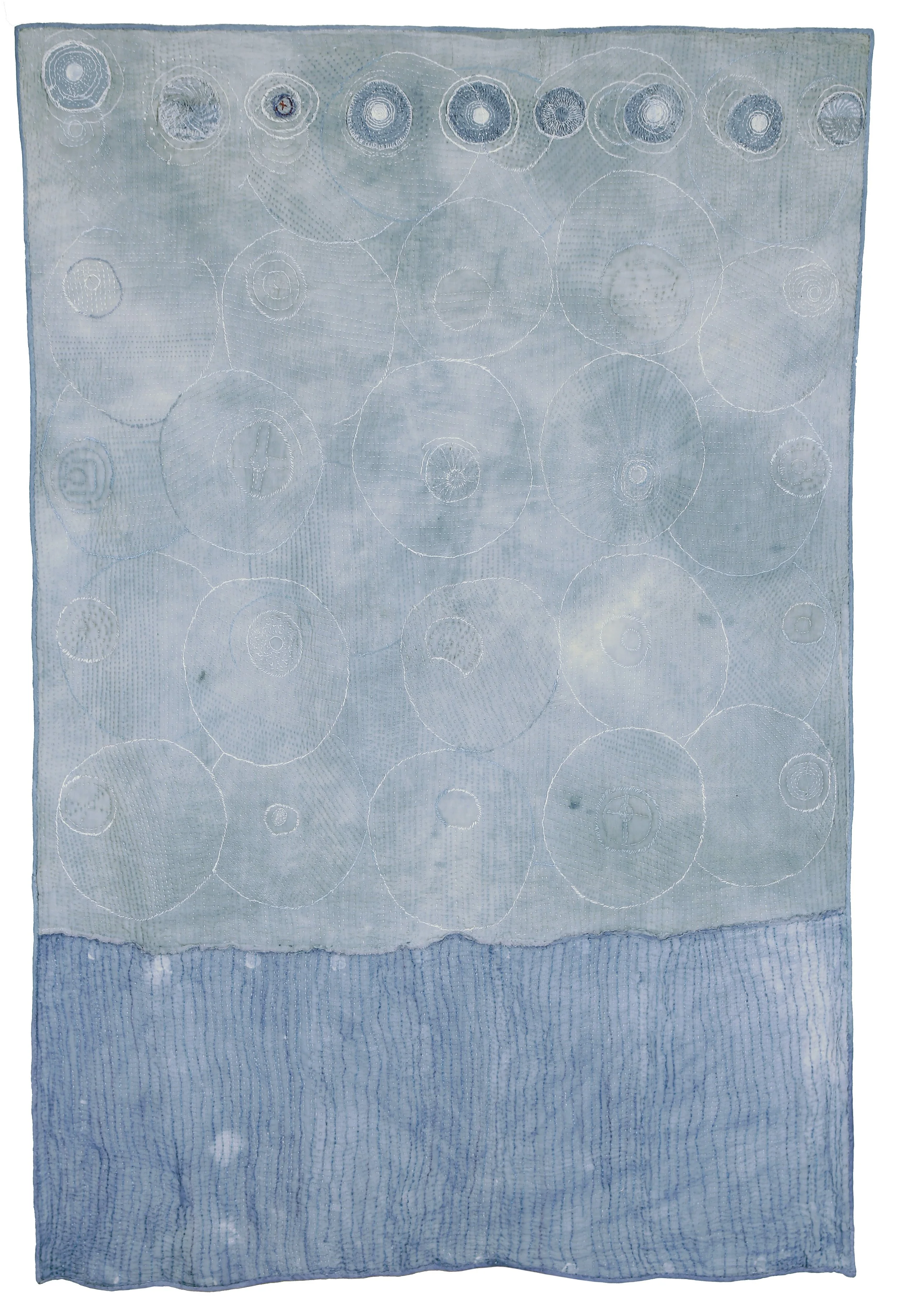 indigo dye on wool and silk gauze fabrics, applique and hand stitch, a two-sided textile. 76” x 55” (193 cm x 139 cm), 2025.
