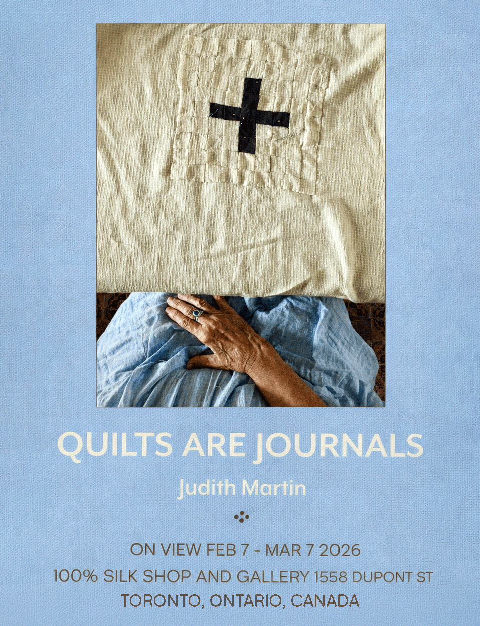 100% Silk Shop is deeply honoured to present the work of celebrated Canadian quilt artist Judith Martin in an upcoming exhibition featuring work that spans more than 50 years of her career. Martin is a self-taught quilter from North Western Ontario who began quilt-making as an art practice in her twenties, recognizing early on that quilting has a great power to heal. In the present day, Martin’s work has become more intricate, focused and meditative. Yet it always remains deeply personal, with pieces and symbols transforming over time as their biographical purpose changes. You will not want to miss it!