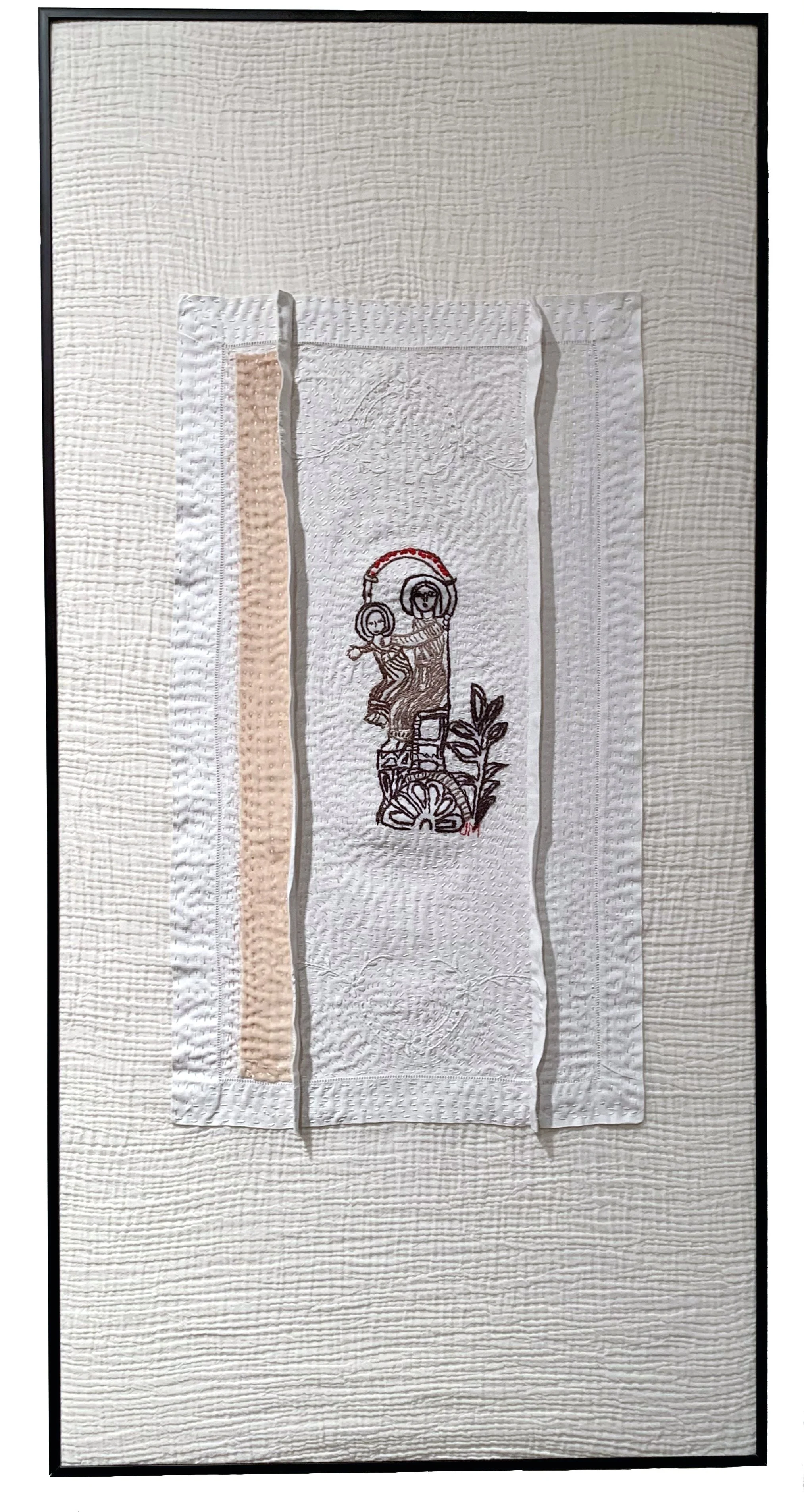 silk thread embroidery on vintage linen with cotton muslin surround, 40” x 20” (102 cm x 50 cm) framed size. 2023.
