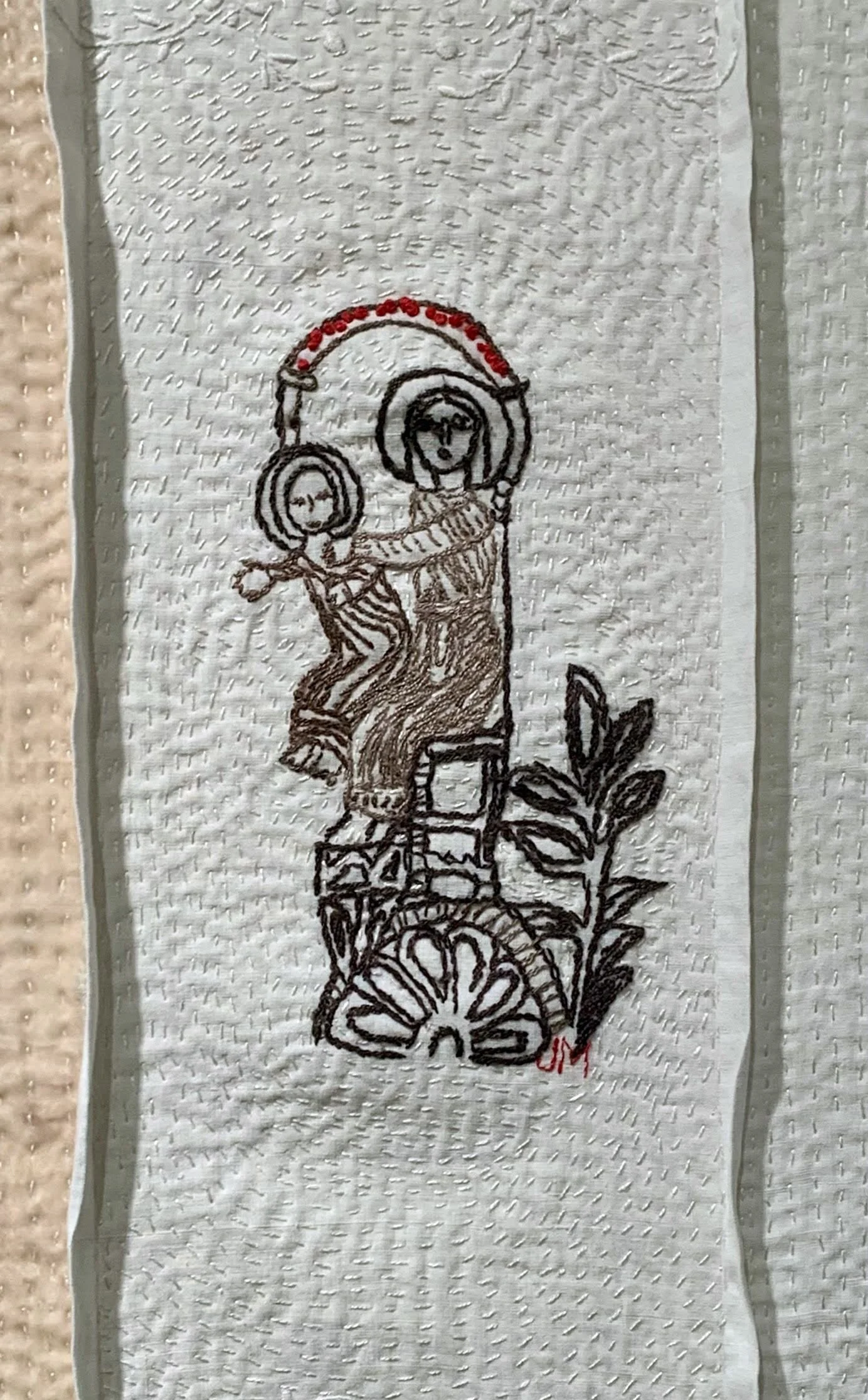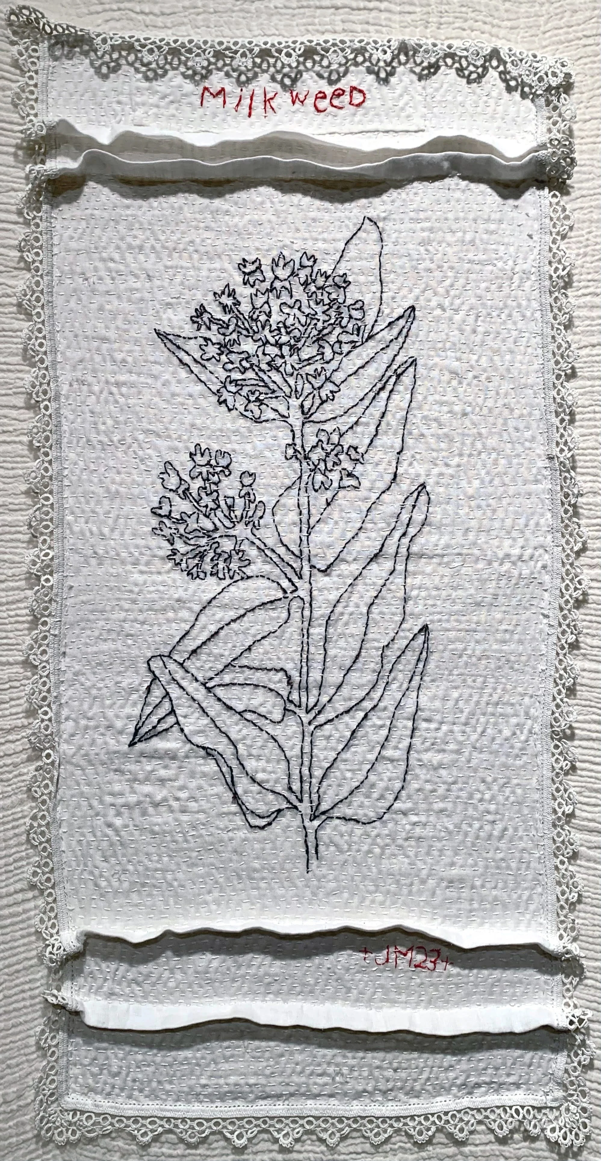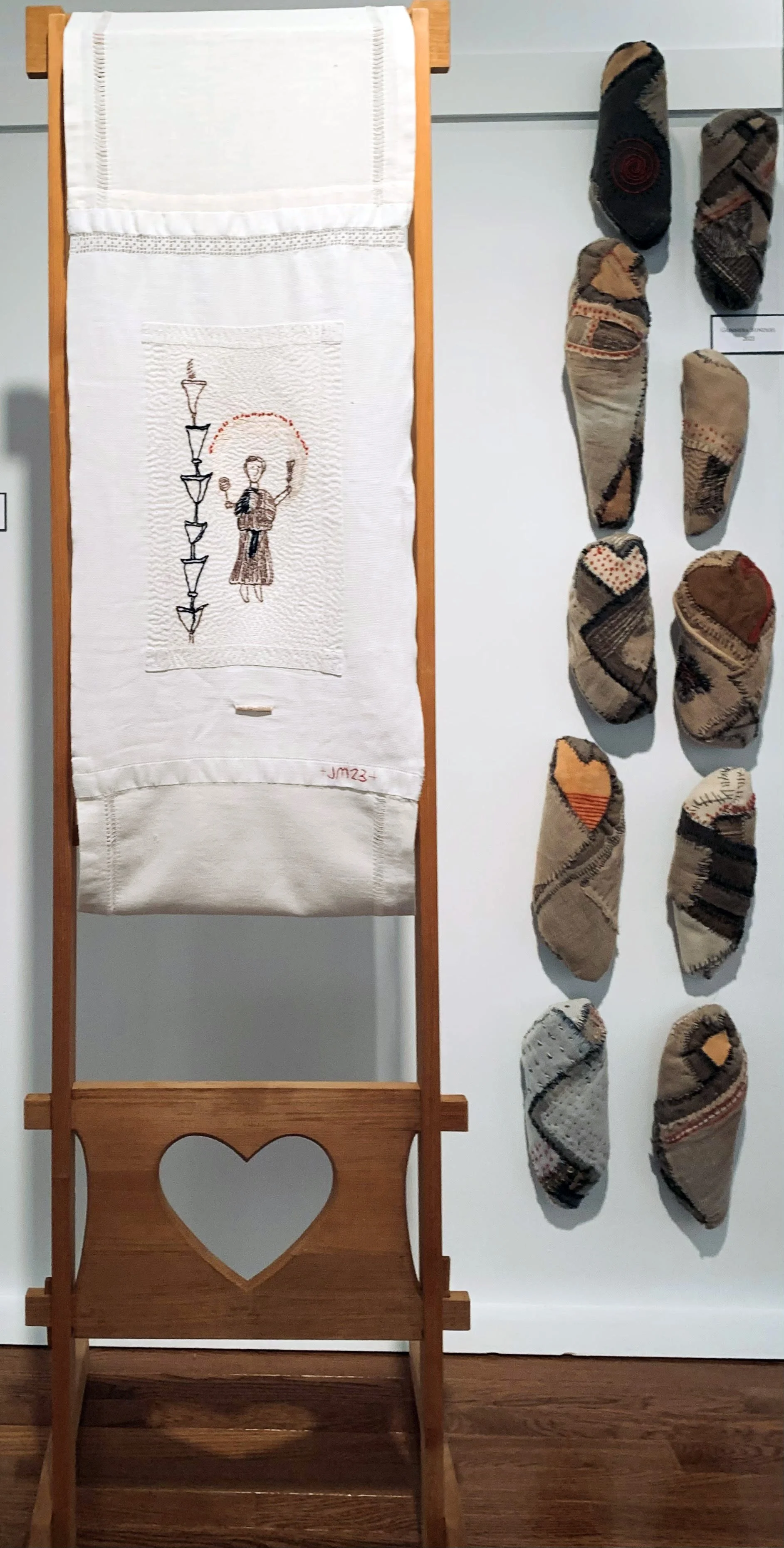 silk thread embroidery on vintage linen place mat mounted on vintage linen towel, 38” x 15” (96.5 cm x 38 cm) on 6 foot high ( hand-crafted wooden display stand over 6 feet (1.8 m) tall 2023. Displayed with bundles of leaves from the artist's garden in the Stardust exhibition, Gore Bay Museum, 2023.